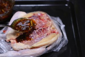 戴上一次性手套,蘸着腌料按摩鸡的全身,按摩两三分钟,以便更好地入味;