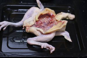 把鸡洗净,从肚子中间部位剪开,控干水分;