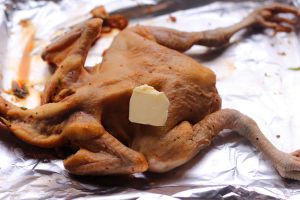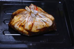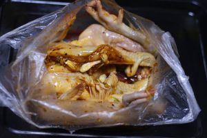 把鸡装入食品袋,把腌料放在鸡胸膛里;