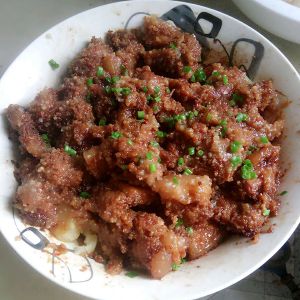 五花肉用生抽老抽料酒腌制一会,然后把米粉倒进去抓均匀,土豆放在碗底,把肉盖在土豆上