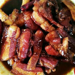 另起火架锅,锅内倒入油,放入糖,不停搅拌直至熬成发红的糖色,放入五花肉让其均匀上色后加入香叶,八角,干红椒,白芷,桂皮,花椒,稍许放入葱姜蒜,加盐,倒入料酒,酱油,老抽,翻炒均匀。