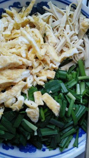 煎好的蛋饼切丝,豆腐皮洗净切丝,韭菜洗净切段备用