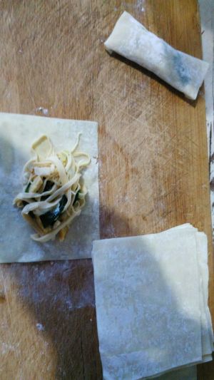 将拌好的馅料放入馄炖皮中包(馄炖皮可以买到现成的)