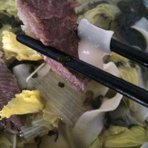 开水下面,再放白菜,滚开,8分熟放牛肉和酸菜,调味出锅即可