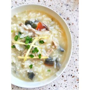 第七步:米熟后加入事先备好的瘦肉和皮蛋