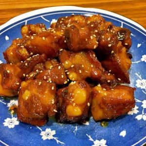 最后大火收汁,当汁快收好时加入两勺细砂糖,三勺康乐醋收汁出锅。摆盘后撒上芝麻会更好看哦!