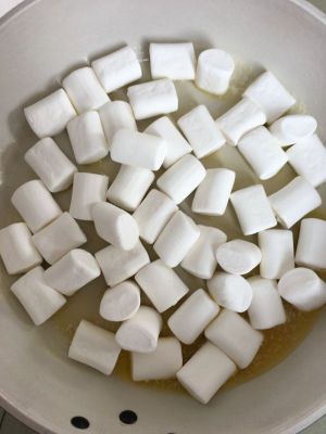 黄油放不粘锅里,小火加热至融化。接着放入棉花糖,用木铲子慢慢的铲棉花糖,防止焦掉。 棉花糖融化的差不多的时候,放入奶粉,翻炒下,尽量均匀。