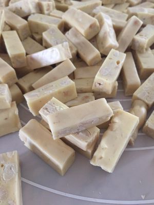 待冷却后,切块即可。美味健康的牛轧糖就做好啦…