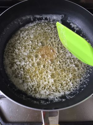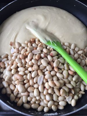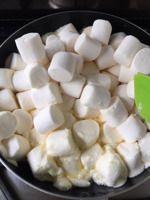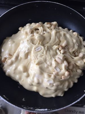 黄油融化后转小火,倒入棉花糖,搅拌至棉花糖全部融化。根据南方天气,棉花糖全部融化后再多熬2~3分钟,可避免牛轧糖过软。