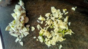 煎鸡翼剩下的油,烧热。放入蒜末,葱头末,爆香。