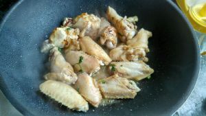 等水焖干,鸡翅出油煎到两边都金黄后,出锅待用。用筷子插入鸡翅头,如果顺利穿过,证明鸡翅已熟。