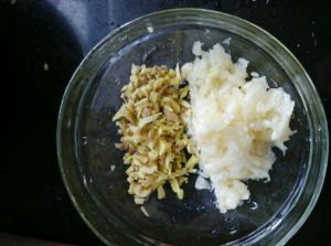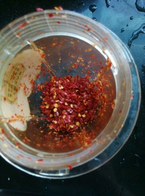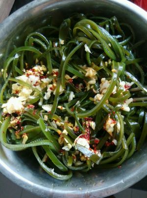 先把步骤3的调料倒进海带丝,再把姜蒜辣椒面放在海带丝上面