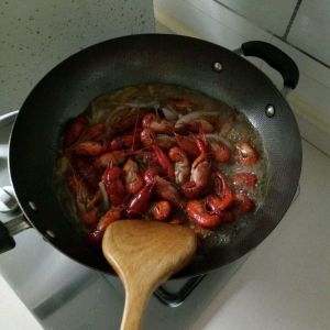 将葱、姜、蒜、小辣椒入锅煸炒、将小龙虾放入翻炒。