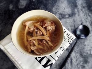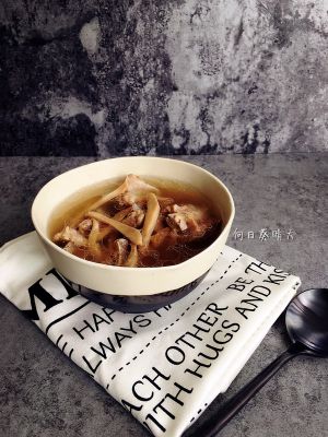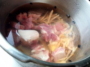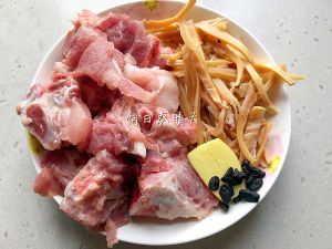 墨鱼先在火上烧一遍(类似于烧猪皮毛,这样做利于泡发后剥皮),再浸泡2h左右。泡好后剥掉皮、去骨、去内脏以及薄膜。墨鱼切粗丝,排骨洗净,姜拍裂。