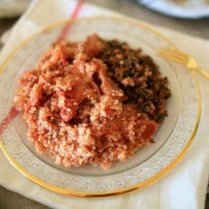 粉蒸肉花花一般会在盘底铺层素菜,可以吸收肥肉溢出的油脂,让肉不太腻,菜也非常香,可以放土豆,豆角之类的,切块洒点盐即可,而最好吃的是放咸菜,这次花花放的是梅菜碎。梅菜是类似雪里红的腌菜,做广式的蒸肉饼常用。