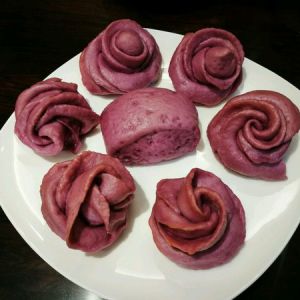 紫薯蒸熟去皮压成泥,面包机加入面粉,紫薯泥、酵母、盐、水,启动揉面程序,面包机停止运行时把面团取出,揉至光滑再放置松弛。