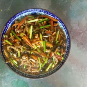 青椒胡萝卜木耳切丝(也可以用蒜苔)刀功不好