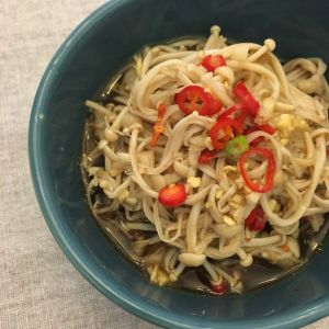 金针菇切去根,洗净放入开水中煮三到五分钟捞出