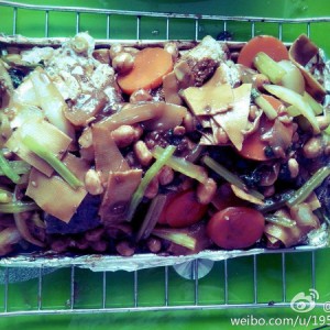 把时蔬自己喜欢的菜放豆瓣酱炒好铺在腌好的鱼上放入烤箱