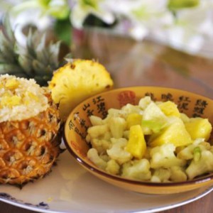 菠萝饭:把泡好的江米与白糖、枸杞、菠萝小丁拌匀装入菠萝碗中,放入蒸锅蒸大约1个半小时至熟即可。(我是在电压力锅中蒸的,所以时间要短很多)