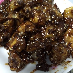 倒入排骨,翻炒,不停翻炒,让锅里的糖都沾在每一个排骨上面后加入酱油,再翻炒半分钟,加入醋,炒匀后撒上芝麻,起锅
