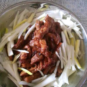 将葱切丝,放入盘中,大功告成!不爱吃葱的朋友加黄瓜丝也可以