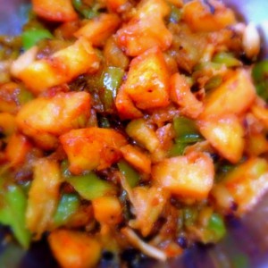 捞出土豆,放入茄子炸至变色捞出,把锅内的油倒出来些留少许,将葱姜蒜放进锅内爆香在放入青椒翻炒