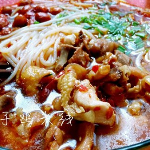 再堆上鸡肉,淋上炖鸡的汁水,撒上花生米和葱末即可~