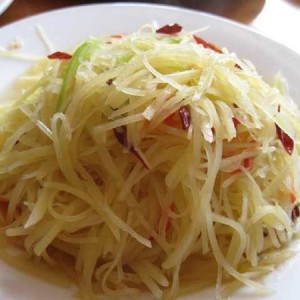热锅放油,放花椒,辣椒,干红椒,蒜瓣,葱花煸出香味之后放土豆丝。过后倒点白醋,放盐,味精,出锅即可