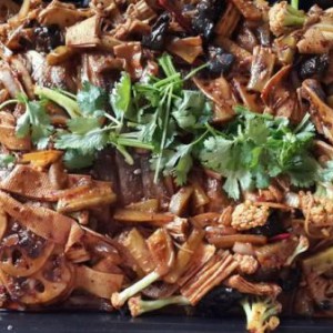 热锅凉油,放入葱花辣椒炒香,放入香锅调料拌匀,再放入配菜,先放不好熟的笋,藕,菜花,再放好熟的木耳腐竹等,炒熟之后鱼也正好烤好了,把炒好的菜到在烤鱼上面,再撒上香菜即可。