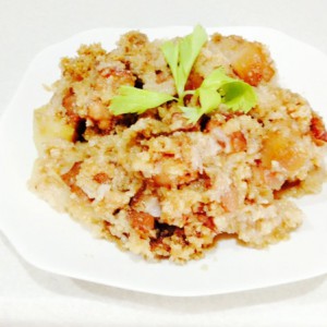 准备一个土豆切块,腌好的五花肉放入适量的粉拌匀,我用的是五香蒸肉粉,如果搅拌时太干,可以加一点点冷开水。