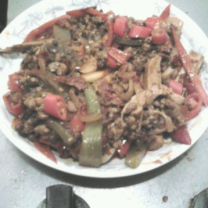 肉末盛出剩下油,加辣椒,葱姜蒜,豆瓣酱一起炒。