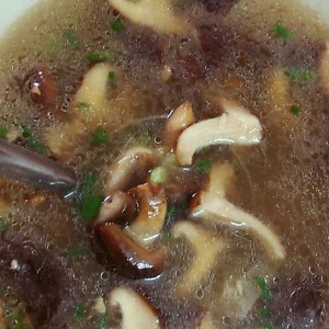 熬至明显闻到香菇香味,差不多已熟加入腌好的肉片,用锅铲弄散