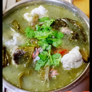 鱼汤煮好后,加入适量盐,鸡精调味,在鱼汤沸腾状态下,迅速下入浆好的鱼片,鱼片断生就可以了。