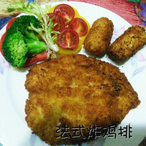 鸡胸肉从中间平切,不切断,打开成一大片,用刀背轻轻剁几下,拍几下,把肉质拍松,两面均匀撒些盐和黑胡椒碎,腌10分钟。将鸡肉合上,中间夹上火腿片和奶酪片。将鸡胸肉放淀粉盘内,裹匀淀粉,再裹一层鸡蛋液,最后再沾满面包糠,压实,备用。