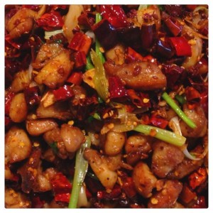 热锅中留适量底油,小火下姜蒜片,炒出香味后放花椒、干辣椒、八角,依旧用小火,炒至辣椒变色出香味后倒入鸡块翻炒,加糖炒匀,待起锅时放入小葱段及香菜,关火,继续翻炒,出锅。