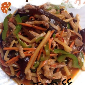 油锅烧热下姜末蒜末加入郫县豆瓣酱和剁椒爆出香味,依次倒入蔬菜丝翻炒,等菜半熟了放入肉丝继续翻炒。倒入准备好的汁(醋、酱油、香油兑水)勾芡,最后撒上葱花加点味精就OK了。