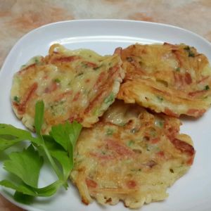 煎锅放一点油加热,把模具放进煎锅里,再把土豆面糊放进圈圈里。中火小火煎至微黄,反面过来煎另一边,两面煎至金黄即可。