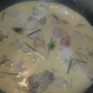 待煮出排骨香味后,转小火慢慢炖,炖至汤色鲜浓,将大蒜叶放入。
