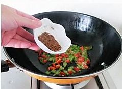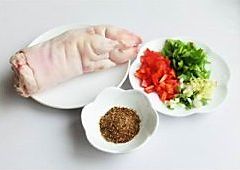 锅中留底油,下葱、姜末炒香,放入青红椒粒炒熟,撒椒盐出锅,倒在猪蹄上即可