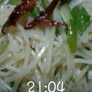 油入锅烧热,放入葱姜蒜干红椒,爆香在放入土豆丝翻炒几次,到入白醋,在次翻炒几次把青椒丝放入锅中一起翻炒。
