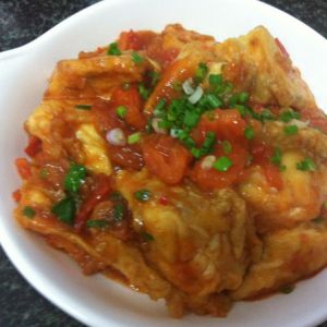 炸过豆腐的花生油倒起,锅里剩一点底油烧热,葱头爆出香味,番茄倒下炒出沙后加一点水、鸡粉、李锦记番茄汁炒出浓汁倒下豆腐略煮一下即可。不要大力翻动哦,以免影响美观。