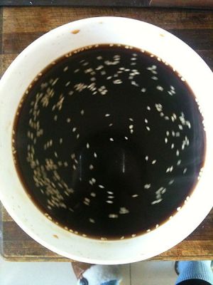 调汤汁,盐,醋,老抽,白糖,鸡精,芝麻,加一点水。