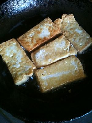 先把豆腐煎一下,煎成金黄色出锅备用。