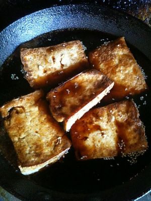 把调好的汤汁倒入煎好的豆腐里,大火收汁,余出来一点汤汁浇在豆腐上。就是这么的简单、