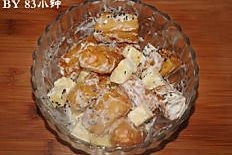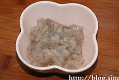 鲜虾挑去虾线,去头,剥掉虾壳洗净。把虾肉切成小粒,加少许葡萄酒,盐,胡椒粉稍腌。