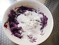 紫薯泥中加入糯米粉、砂糖,加入适量水和成紫薯面团;