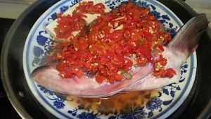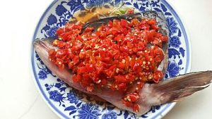 将鱼头下面铺上姜丝,上面铺满剁椒,具体多少根据自己的口味,此时就不需要放盐了,因为剁椒本身就很咸。