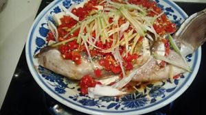 蒸完的鱼将盘中水倒掉,淋上蒸鱼豉油,铺上姜丝,葱丝,萝卜丝,将锅放稍多些的油,烧至稍微有些冒烟,倒在鱼上。