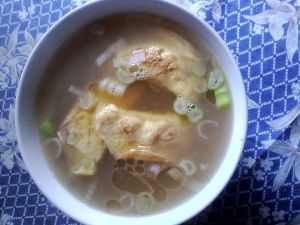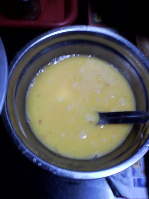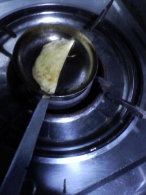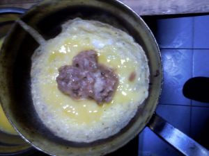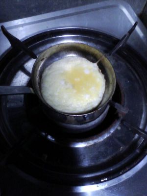 在勺子上抹点猪油,鸡蛋摊成圆饼。